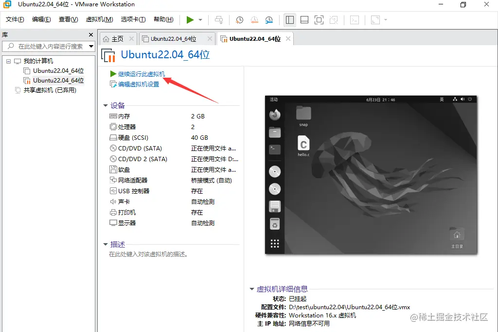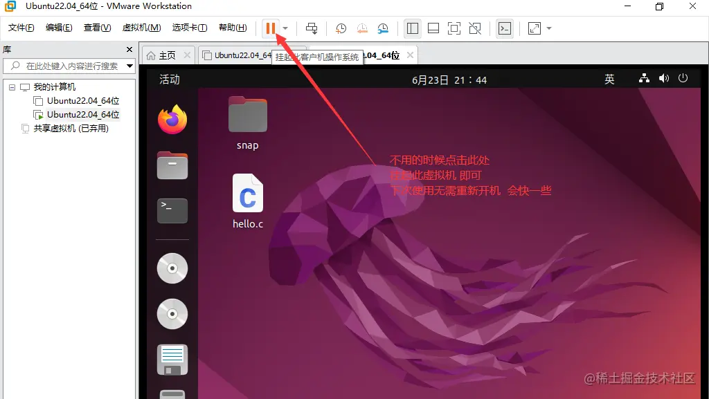 等不需要使用Ubuntu的时候,点击挂起即可,虚拟机挂起就相当于休眠,下次想使用是直接打开无需重复执行开机操作,即可快速回到挂起前的状态。