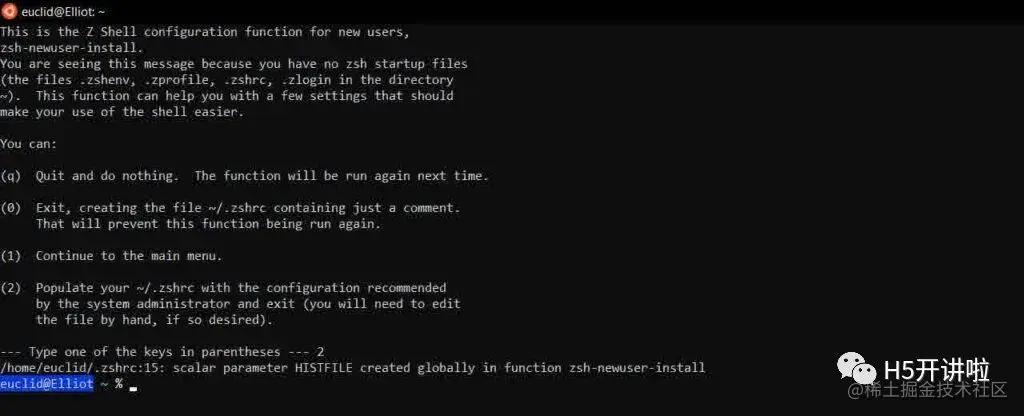 等待下载完成。现在,您可以使用zsh命令启动Zsh shell。第一次启动Zsh时,您将提示进行首次设置。只需按2键创建一个具有推荐默认设置的配置文件即可。