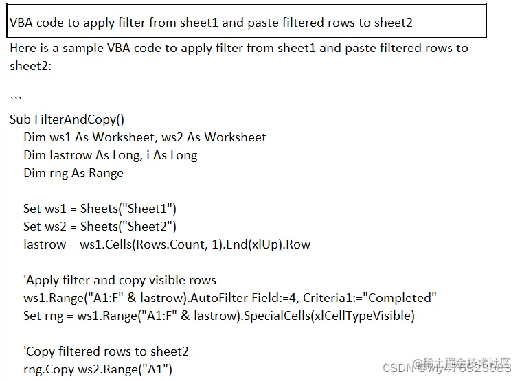sheet1用于应用过滤器并将过滤后的行粘贴到的VBA 代码sheet2