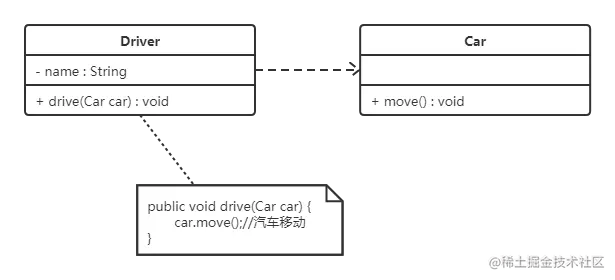 在 UML 类图中,依赖关系使用带箭头的虚线来表示,箭头从使用类指向被依赖的类。下图所示是司机和汽车的关系图,司机驾驶汽车: