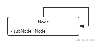 自关联在UML类图中用一个带有箭头且指向自身的线表示。上图的意思就是Node类包含类型为Node的成员变量,也就是“自己包含自己”。(链表)