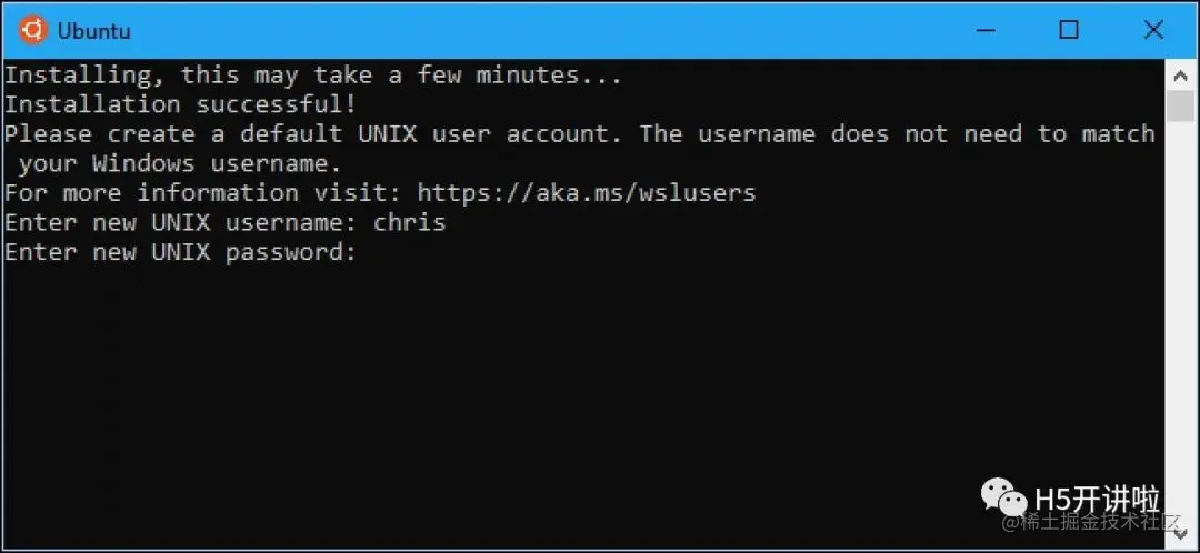 创建一个新的 Unix 用户名和密码,此帐户不必与您的 Windows 帐户相同。在所需字段中输入用户名,然后按回车键(您不能使用用户名 "admin")。