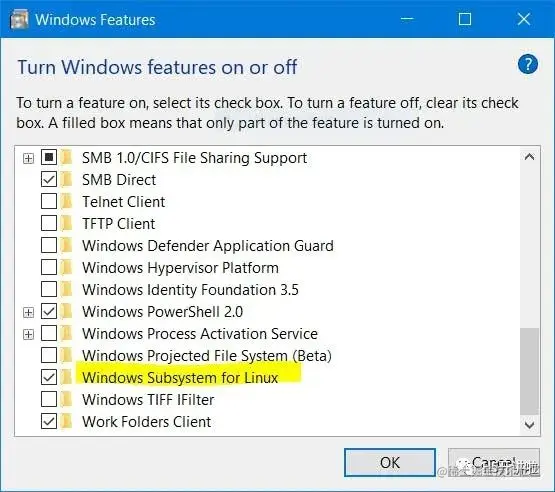 勾选 Windows 子系统用于 Linux 选项,然后点击确定。