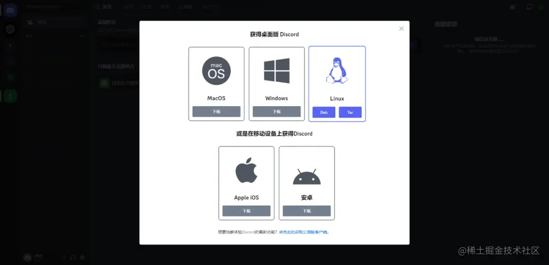 进入 Discord 默认对话页面,点击左侧导航栏的下载按钮下载客户端