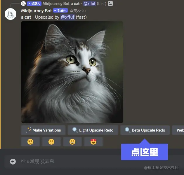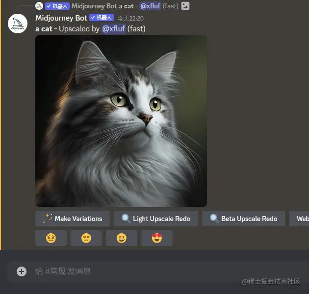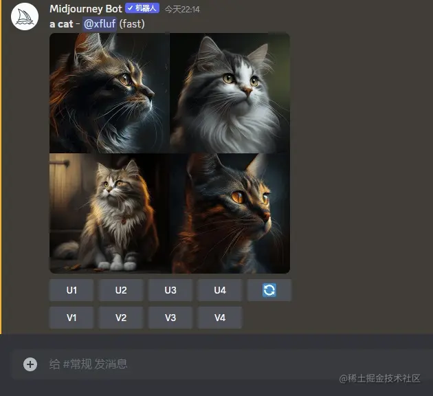 常用指令为"/imagine",在对话框中输入此指令加空格,在 prompt 后输入关键词(如:a cat)点击回车,系统就会生成对应的插画