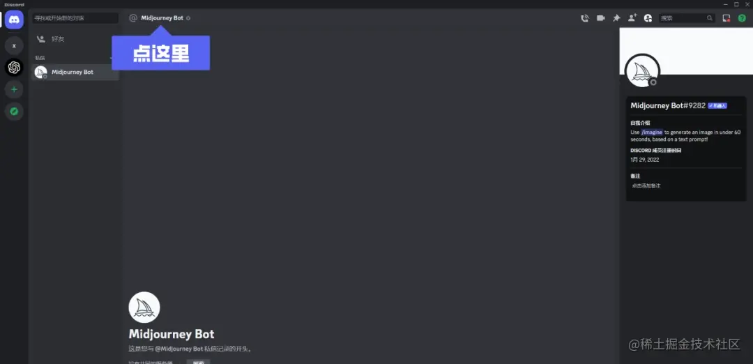 ① 打开软件进行登录,在默认对话页面,点击顶部的"寻找或开始新的对话"输入框,搜索"Midjourney Bot"