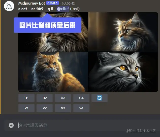 对话框中不仅可以输入关键词,还可以输入后缀来调整图片质量;比如--ar 16:9,代表生成 16:9 尺寸的图片;--q 5 代表输出高质量的图片(图片质量从 q 1 到 q 5)