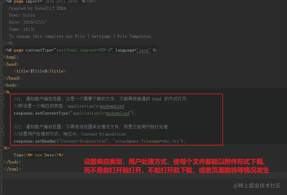 通知客户端浏览器: 不再有浏览器来处理该文件, 而是交由用户自行处理 设置响应流中文件进行下载,attachment以附件形式下载,filename= 表示下载显示的下载文件名。
