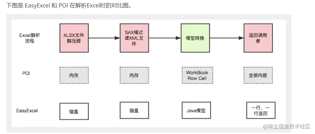 2poi会一次性全部读取和返回execl表格的数据,但是easyExcel不会这样,它没有将文件数据一次性全部加载到内存中,而是从磁盘上一行一行的读取,逐个解析
