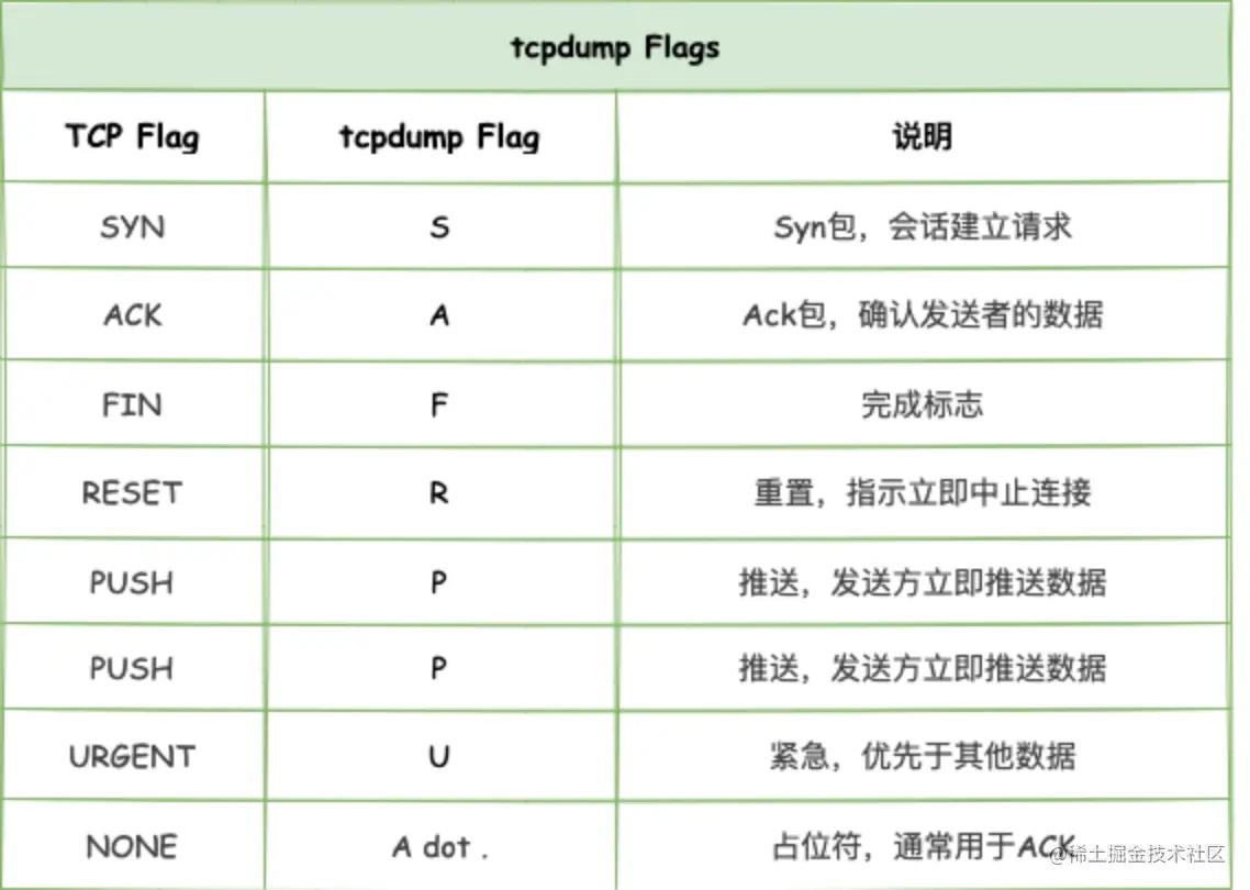 输出结果中的Flags信息使用的是简写,补充一张Flags具体说明: