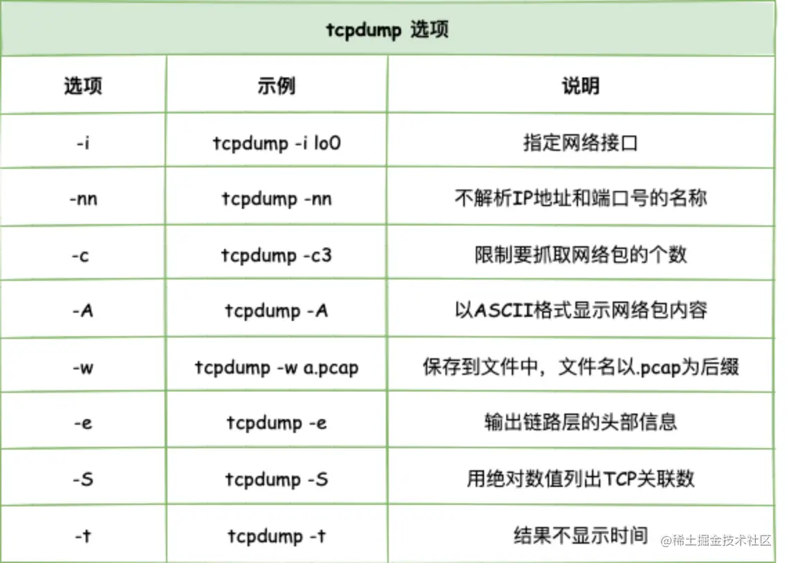 tcpdump 提供了大量的选项以及各式各样的过滤表达式。不过只需要掌握一些常用选项和过滤表达式,就可以满足日常使用需要了。下面是一些最常见的用法: