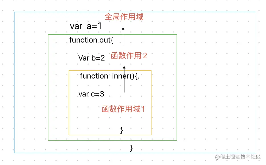 当多重的作用域嵌套的时候就会产生一个由里向外的作用域链。作用域链的规则是:js引擎从当前执行的作用域开始,先查看当前作用域是否存在,若如果不存在则继续向外寻找,直接找到最外层的全局作用域,才会停止查找。
