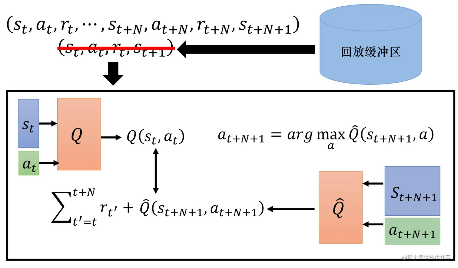 我们记录在 采取 ,得到 时,会进入的 。一直记录到第 个步骤以后,在 采取 ,得到 ,进入 的这些经验,把它们保存下来。实际上在做更新的时候,在做Q网络学习的时候,我们要让 与目标值越接近越好。 所计算的不是 的,而是 的奖励。我们会把 个步骤以后的状态 输入到 中去计算 个步骤以后会得到的奖励。如果要算目标值,要再加上多步(multi-step)的奖励 ,多步的奖励是从时间 一直到 的 个奖励的和。我们希望 和目标值越接近越好。