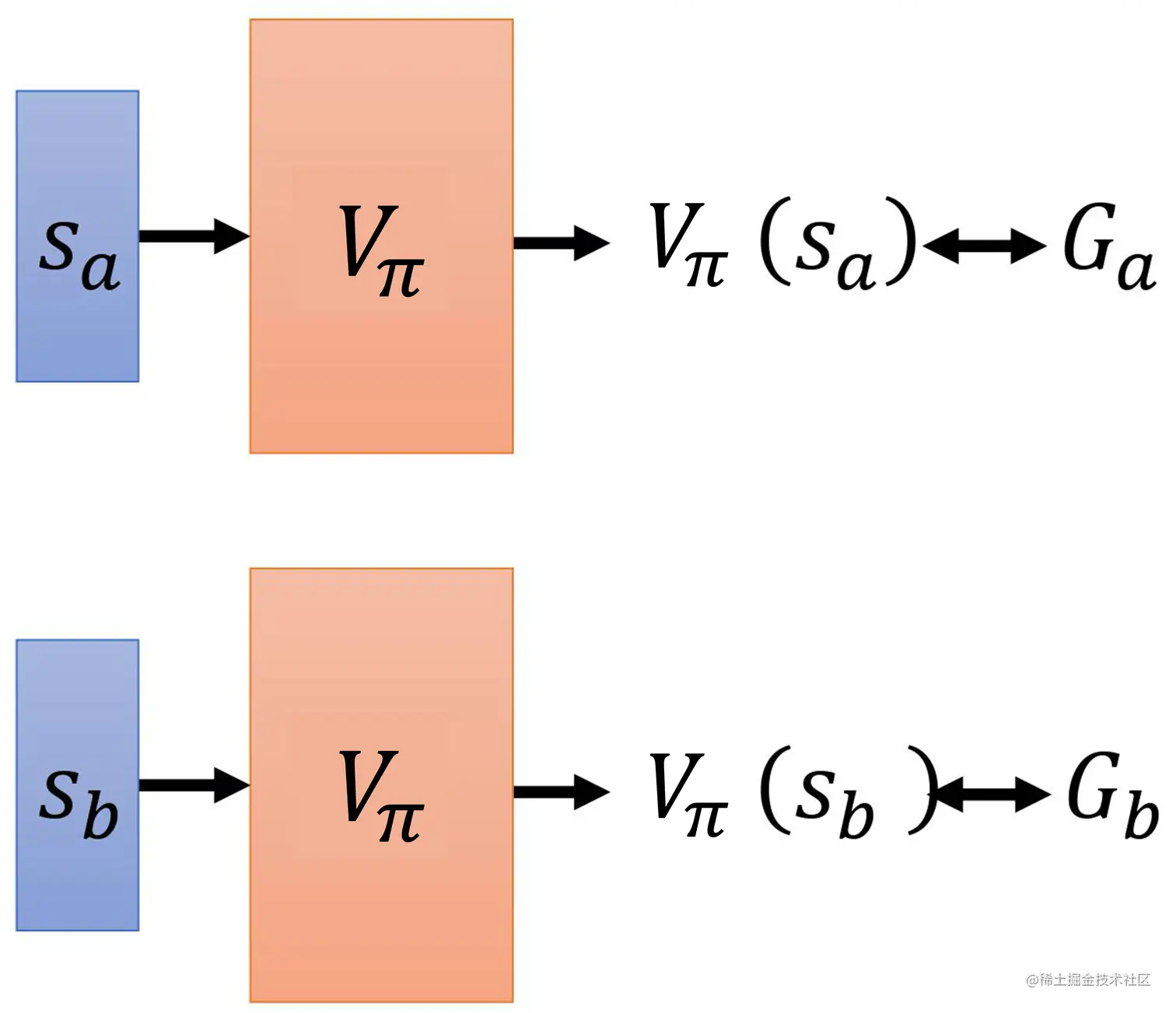 其中,具有随机性。因为即使我们在 采取同一个动作,得到的奖励也不一定是一样的,所以 是一个随机变量。但 的方差比 要小,因为 是很多 的加和,时序差分只是某一个 而已。 的方差会比较大, 的方差会比较小。但是这里我们会遇到的一个问题是 的估计不一定准确。假设 的估计不准确,我们使用式(4.3)学习出来的结果也会是不准确的。所以蒙特卡洛方法与时序差分方法各有优劣。其实时序差分方法是比较常用的,蒙特卡洛方法其实是比较少用的。