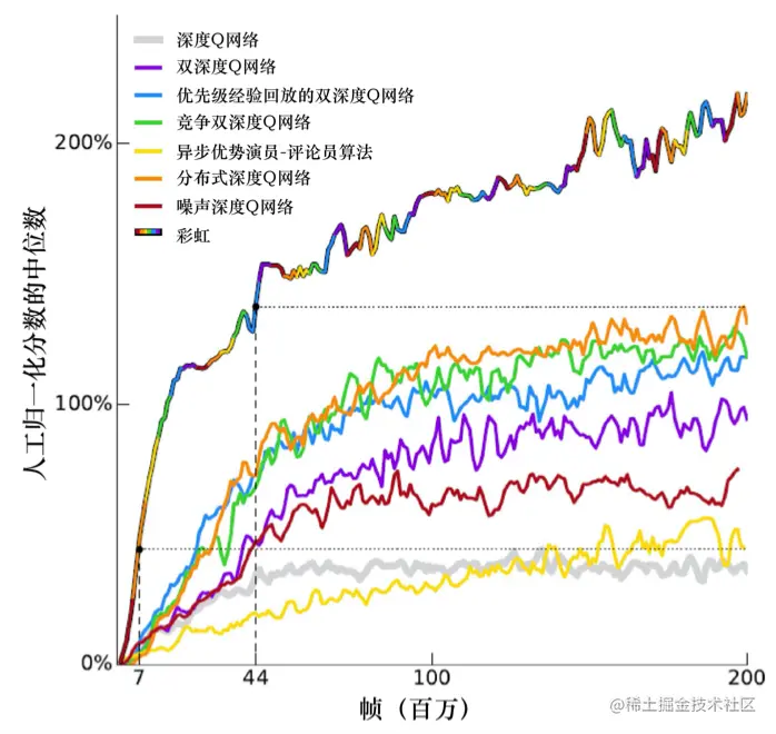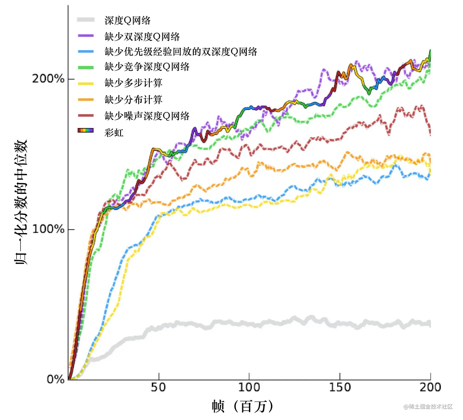 最后一个技巧称为彩虹(rainbow),如图 4.24 所示,假设每个方法有一种自己的颜色(如果每一个单一颜色的线代表只用某一个方法),把所有的颜色组合起来,就变成“彩虹”,我们把原来的深度Q网络也算作一种方法,故有 7 种颜色。横轴代表训练过程的帧数,纵轴代表玩十几个雅达利小游戏的平均分数的和,但它取的是分数的中位数。为什么是取中位数而不是直接取平均呢?因为不同小游戏的分数差距很大,如果取平均,某几个游戏可能会控制结果,因此我们取中位数。如果我们使用的是一般的深度Q网络(灰色的线),深度Q网络的性能不是很好。噪声深度Q网络(noisy DQN)比DQN的性能好很多。紫色的线代表 DDQN,DDQN 还挺有效的。优先级经验回放的双深度Q网络(prioritized DDQN)、竞争双深度Q网络(dueling DDQN)和分布式深度Q网络(distributional DQN)性能也挺高的。**异步优势演员-评论员(asynchronous advantage actor-critic,A3C)**是演员-评论员的方法,A3C算法又被译作异步优势动作评价算法,我们会在第九章详细介绍异步优势演员-评论员算法。单纯的异步优势演员-评论员算法看起来是比深度Q网络强的。图 4.24 中没有多步方法,这是因为异步优势演员-评论员算法本身内部就有多步方法,所以实现异步优势演员-评论员算法就等同于实现多步方法,我们可以把 异步优势演员-评论员算法的结果看成多步方法的结果。这些方法本身之间是没有冲突的,我们把全部方法都用上就变成了七彩的方法,即彩虹方法,彩虹方法的性能很好。