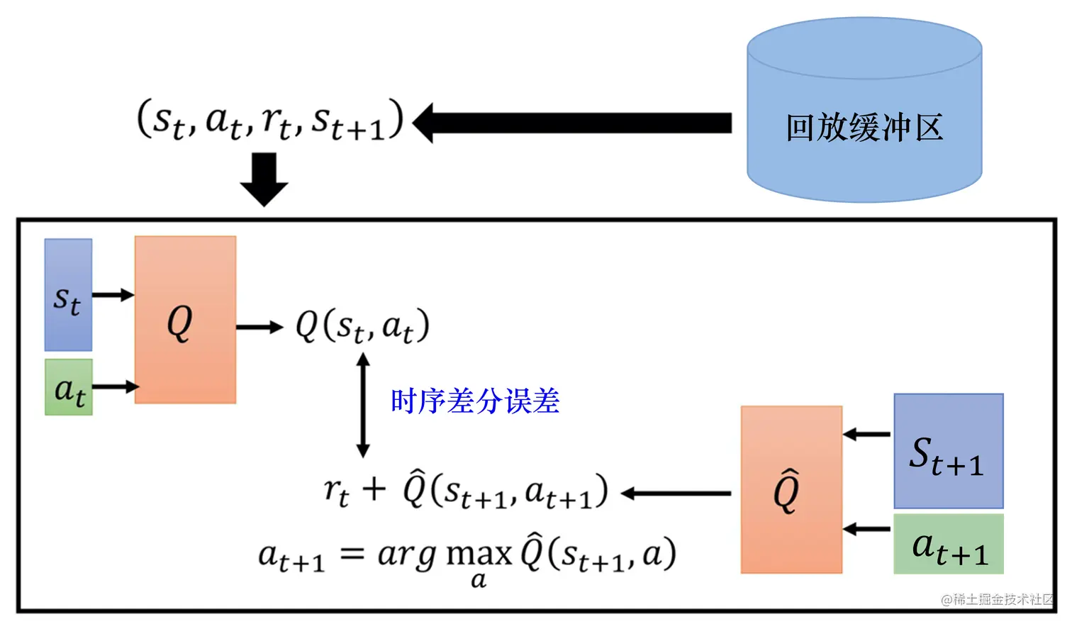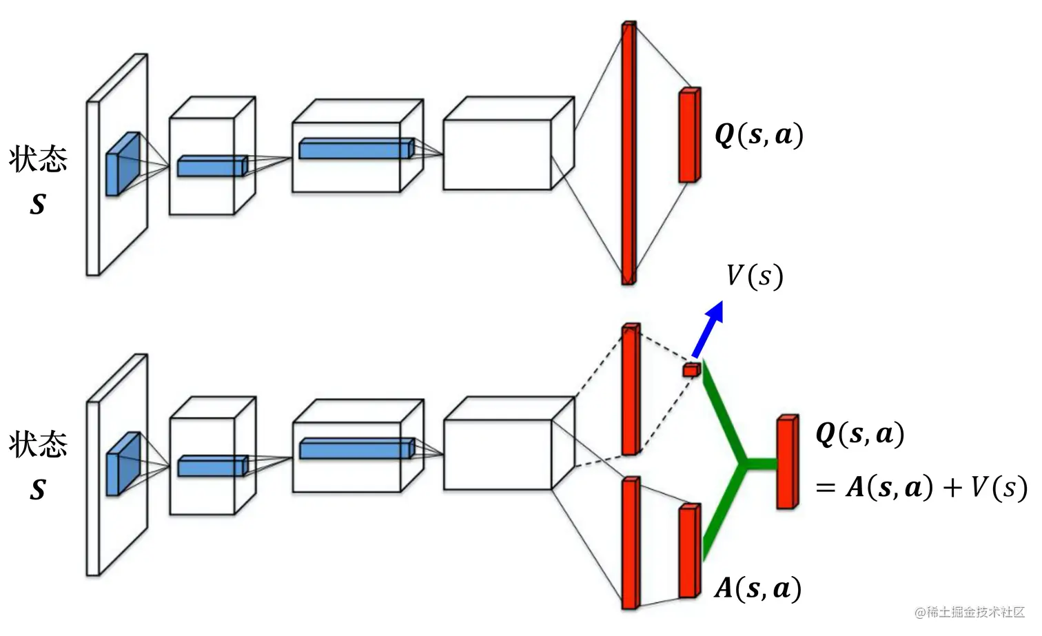 其中,、 分别是状态 和动作 的向量表示,函数 通常是一个参数为 的函数,比如神经网络,其输出为一个实数,称为 Q 网络(Q-network)。
