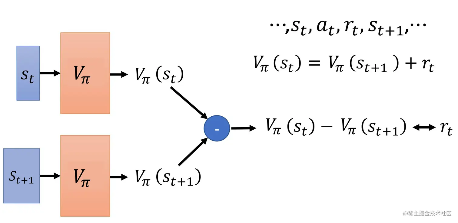 假设我们现在用的是某一个策略,在状态 时,它会采取动作 ,得到奖励 ,接下来进入 。状态 的值与状态 的值,它们的中间差了一项 ,这是因为我们把 的值加上得到的奖励 就可以 得到 的值。有了式(4.1),在训练的时候,我们并不是直接估测 ,而是希望得到的结果 可以满足式(4.1)。我们是这样训练的,如图 4.3 所示,我们把 输入网络,因为把 输入网络会得到 ,把 输入网络会得到 , 减 的值应该是 。我们希望它们相减的损失与 接近,训练下去,更新 的参数,我们就可以把 函数学习出来。