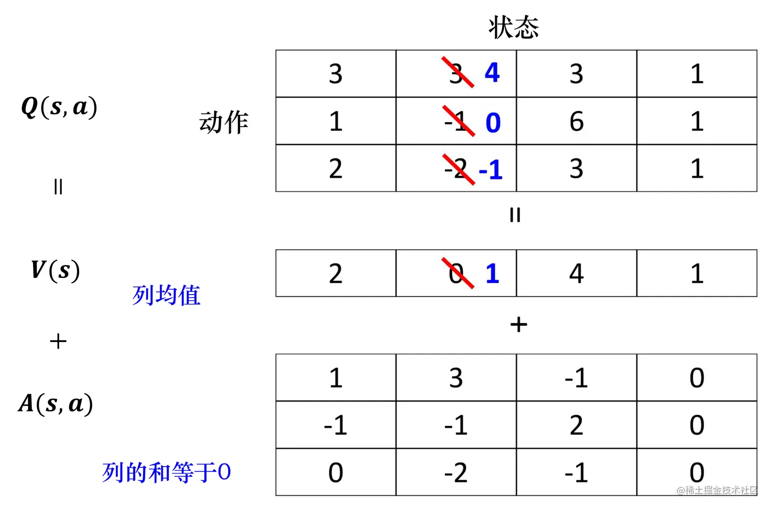 其中, 对不同的状态,都有一个值。 对不同的状态、不同的动作都有一个值。我们把 的每一列的值加到的每一列就可以得到 Q 值,以第一列为例,有 2+1、2+(-1)、2+0,可以得到 3、1、2,以此类推。