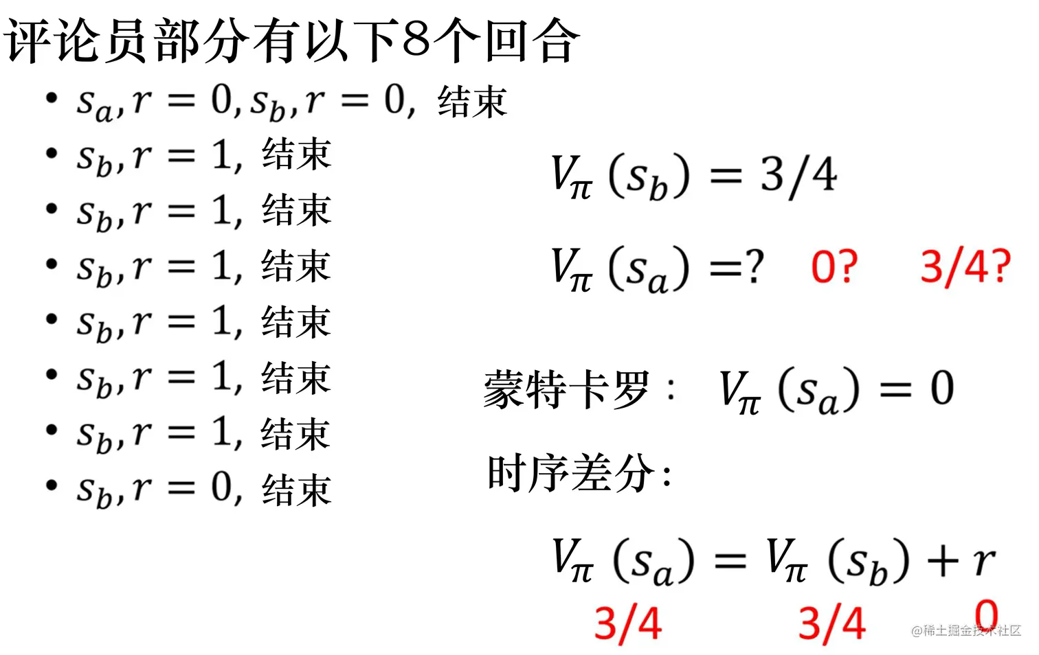 (2)看到 以后, 的奖励是 0 这件事只是巧合,并不是 造成的,而是因为 有时候就是会得到奖励 0,这只是单纯“运气”的问题。其实平常 会得到的奖励期望值是 3/4,与 是完全没有关系的。所以假设 之后会进入 ,得到的奖励按照时序差分方法来算应该是 3/4。