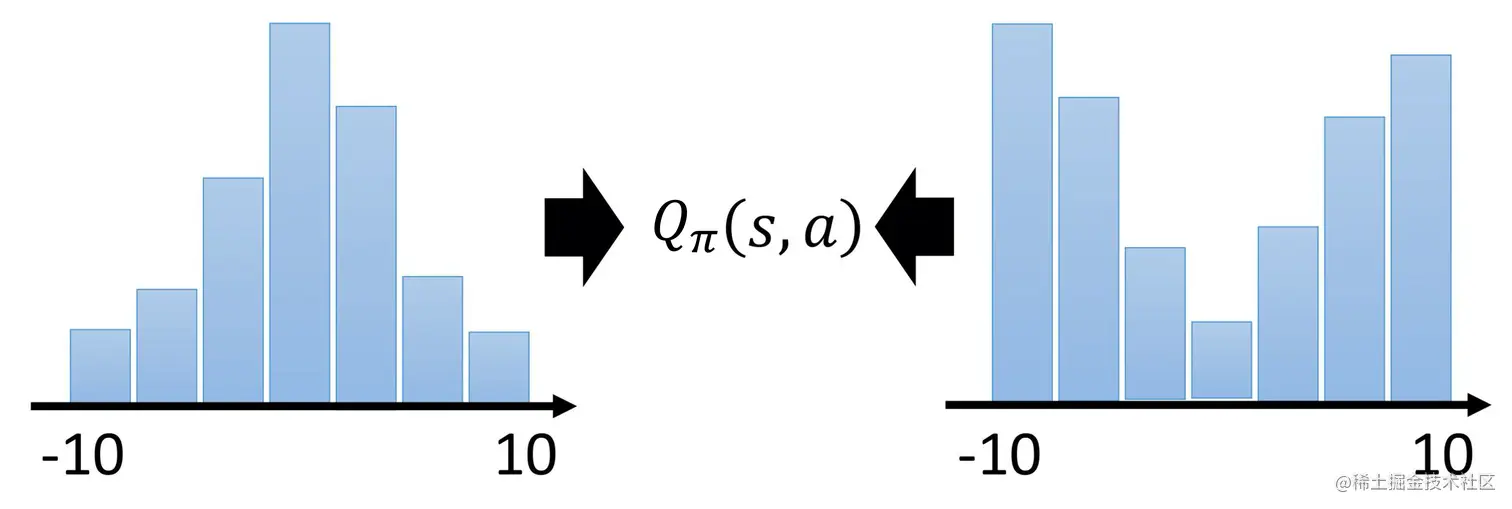 除了选平均值最大的动作以外,我们还可以对分布建模。例如,我们可以考虑动作的分布,如果分布方差很大,这代表采取这个动作虽然平均而言很不错,但也许风险很高,我们可以训练一个网络来规避风险。在两个动作平均值都差不多的情况下,也许可以选一个风险比较小的动作来执行,这就是分布式Q函数的好处。