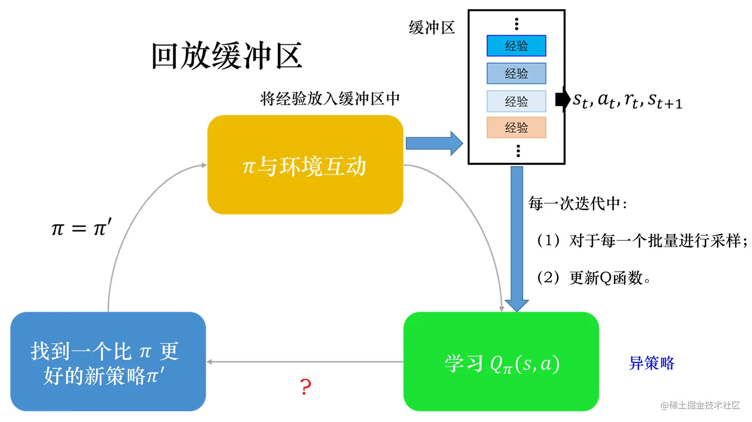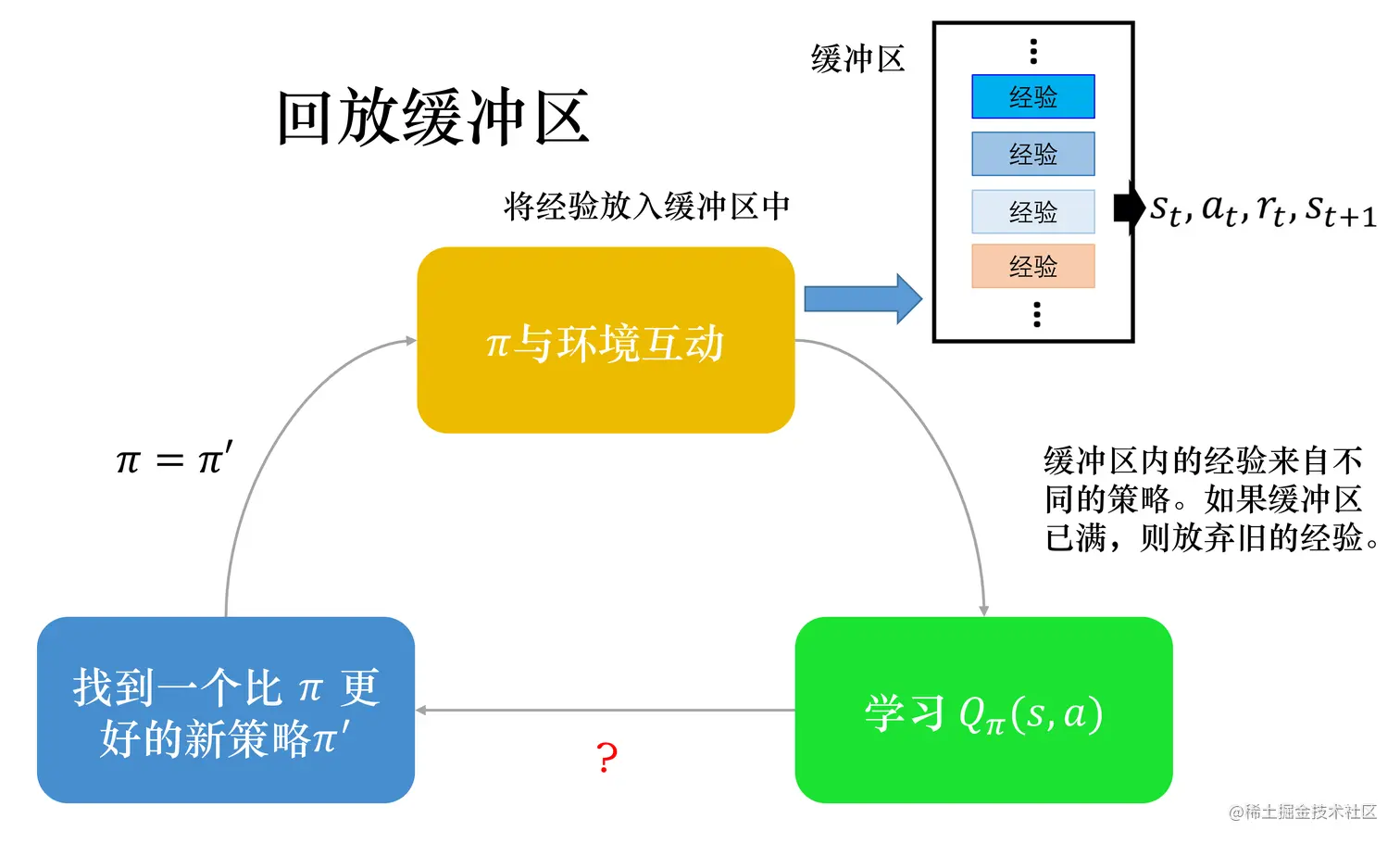 如果某个算法使用了经验回放这个技巧,该算法就变成了一个异策略的算法。因为本来 Q 是要观察 的经验的,但实际上存储在回放缓冲区里面的这些经验不是通通来自于 ,有些是过去其他的策略所留下来的经验。因为我们不会用某一个 就把整个回放缓冲区装满,拿去测Q函数, 只是采样一些数据放到回放缓冲区里面,接下来就让 Q 去训练。所以 Q 在采样的时候, 它会采样到过去的一些数据。