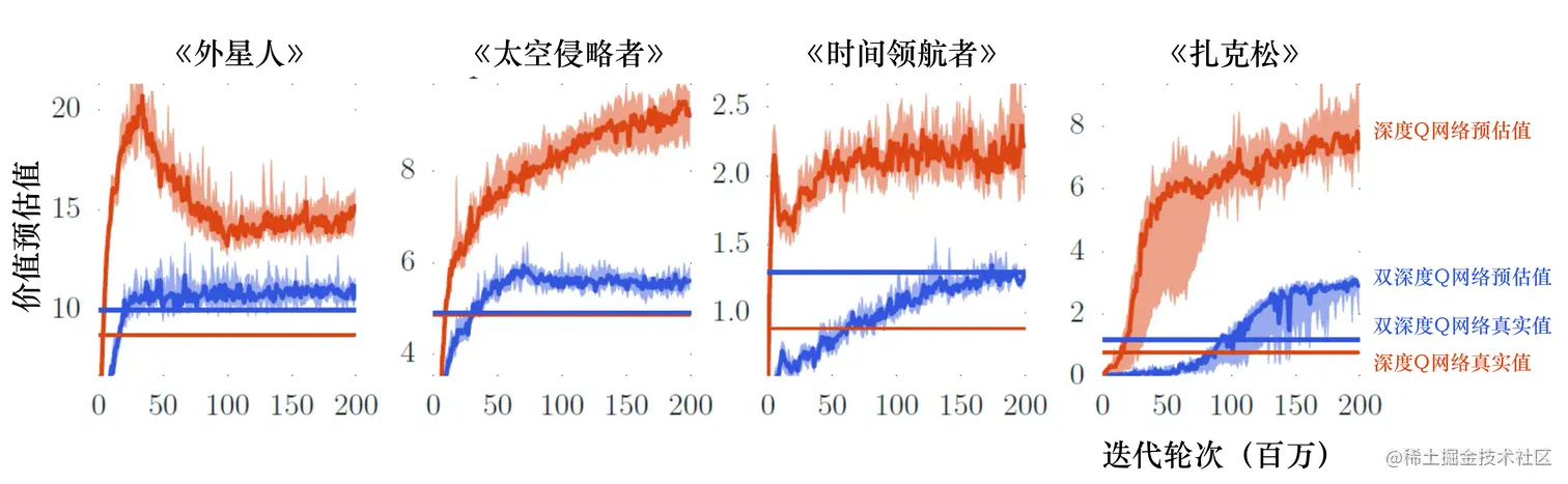接下来我们介绍训练深度Q网络的一些技巧。第一个技巧是双深度Q网络(double DQN,DDQN)。为什么要有DDQN呢?因为在实现上,Q 值往往是被高估的。如图 4.15 所示,这里有 4 个不同的小游戏,横轴代表迭代轮次,红色锯齿状的一直在变的线表示Q函数对不同的状态估计的平均 Q 值,有很多不同的状态,每个状态我们都进行采样,算出它们的 Q 值,然后进行平均。这条红色锯齿状的线在训练的过程中会改变,但它是不断上升的。因为Q函数是取决于策略的,在学习的过程中策略越来越强,我们得到的 Q 值会越来越大。在同一个状态, 我们得到奖励的期望会越来越大,所以一般而言,Q值都是上升的,但这是深度Q网络预估出来的值。接下来我们就用策略去玩游戏,玩很多次,比如100万次,然后计算在某一个状态下,我们得到的 Q 值是多少。我们会得到在某一个状态采取某一个动作的累积奖励是多少。预估出来的值远比真实值大,且大很多,在每一个游戏中都是这样。所以DDQN的方法可以让预估值与真实值比较接近。