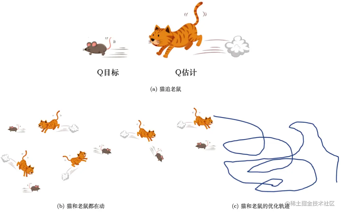 如图 4.10a 所示,我们可以通过猫追老鼠的例子来直观地理解固定目标网络的目的。猫是 Q 估计,老鼠是 Q 目标。一开始,猫离老鼠很远,所以我们想让猫追上老鼠。如图 4.10b 所示,因为 Q 目标也是与模型参数相关的,所以每次优化后,Q 目标也会动。这就导致一个问题,猫和老鼠都在动。如图 4.10c 所示,猫和老鼠会在优化空间里面到处乱动,这会产生非常奇怪的优化轨迹,使得训练过程十分不稳定。所以我们可以固定 Q 网络,让老鼠动得不那么频繁,可能让它每 5 步动一次,猫则是每一步都在动。如果老鼠每 5 次动一步,猫就有足够的时间来接近老鼠,它们之间的距离会随着优化过程越来越小,最后它们就可以拟合,拟合后就可以得到一个最好的Q 网络。