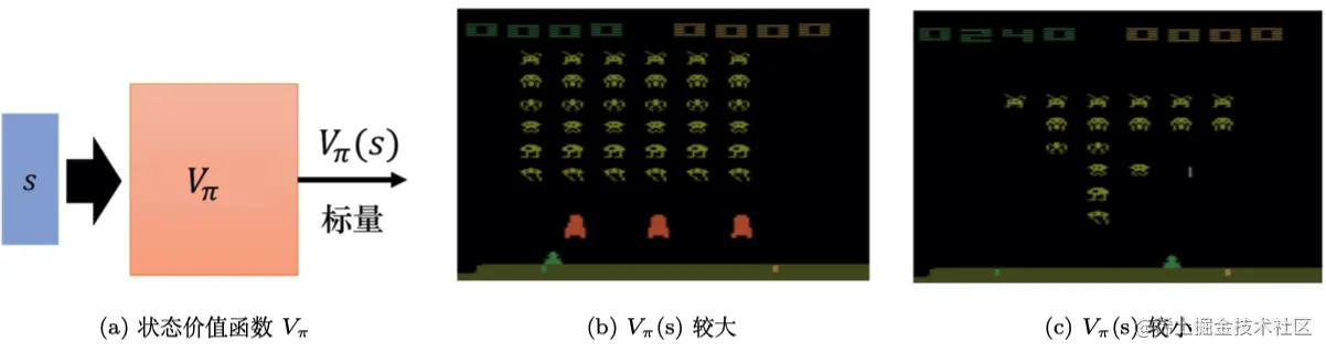 深度Q网络 是基于价值的算法,在基于价值的算法里面,我们学习的不是策略,而是评论员(critic)。评论员的任务是评价现在的动作有多好或有多不好。假设有一个演员,其要学习一个策略来得到尽量高的回报。评论员就是评价演员的策略 好还是不好,即策略评估。例如,有一种评论员称为状态价值函数。状态价值函数是指,假设演员的策略是 ,用 与环境交互,假设 看到了某一个状态 ,例如在玩雅达利游戏,状态 是某一个画面, 看到某一个画面,接下来一直到游戏结束,期望的累积奖励有多大。如图 4.1a 所示, 是一个函数,输入一个状态,它会输出一个标量。这个标量代表演员的策略 看到状态 的时候,预期到游戏结束的时候,它可以获得多大的奖励。例如,假设我们在玩太空侵略者,图 4.1b 所示的状态 ,这个游戏画面, 也许会很大,因为这时还有很多的怪兽可以击杀, 所以我们会得到很高的分数。一直到游戏结束的时候,我们仍然有很多的分数可以获得。图 4.1c 所示的情况我们得到的 可能就很小,因为剩下的怪兽也不多,并且红色的防护罩已经消失了,所以我们可能很快就会“死掉”。因此接下来得到预期的奖励,就不会太大。