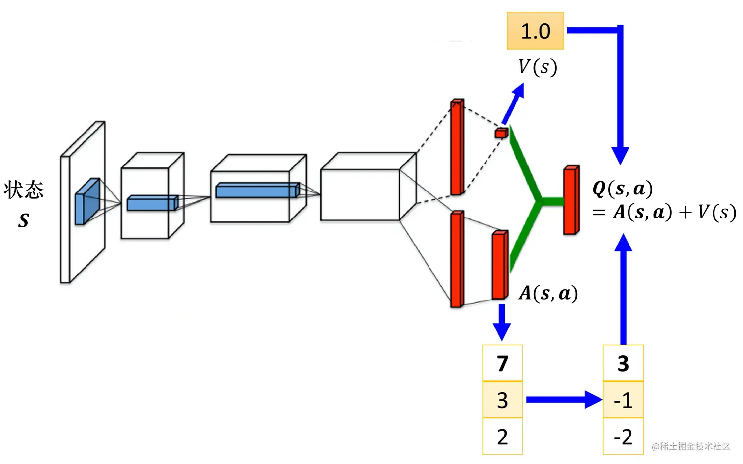 可能会有人认为使用竞争深度Q网络会有一个问题,竞争深度Q网络最后学习的结果可能是这样的:智能体就学到 等于 0, 等于 Q,使用任何竞争深度Q网络就没有任何好处,就和原来的深度Q网络一样。