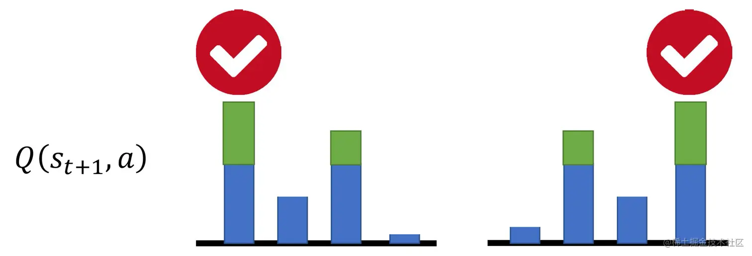 例如,假设我们现在有 4 个动作,本来它们得到的Q值都是差不多的,它们得到的奖励也是差不多的。但是在估计的时候,网络是有误差的。如图 4.16(a)所示,假设是第一个动作被高估了,绿色代表是被高估的量,智能体就会选这个动作,就会选这个高估的 Q 值来加上 来当作目标。如图 4.16(b)所示,如果第四个动作被高估了,智能体就会选第四个动作来加上 当作目标。所以智能体总是会选那个 Q 值被高估的动作,总是会选奖励被高估的动作的Q值当作最大的结果去加上 当作目标,所以目标值总是太大。
