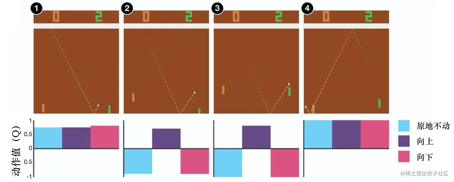 如果我们去估计Q函数,看到的结果可能如图 4.7 所示。假设我们有 3 个动作:原地不动、向上、向下。假设在第一个状态,不管采取哪个动作,最后到游戏结束的时候,得到的期望奖励都差不多。因为乒乓球在这个地方时,就算我们向下,接下来我们应该还可以接到乒乓球,所以不管采取哪个动作,都相差不了太多。假设在第二个状态,乒乓球已经反弹到很接近边缘的地方,这个时候我们采取向上的动作,才能接到乒乓球,才能得到正的奖励。如果我们站在原地不动或向下,接下来都会错过这个乒乓球,得到的奖励就会是负的。假设在第三个状态,乒乓球离我们的球拍很近了,所以就要采取向上的动作。假设在第四个状态,乒乓球被反弹回去,这时候采取哪个动作都差不多。这是动作价值函数的例子。