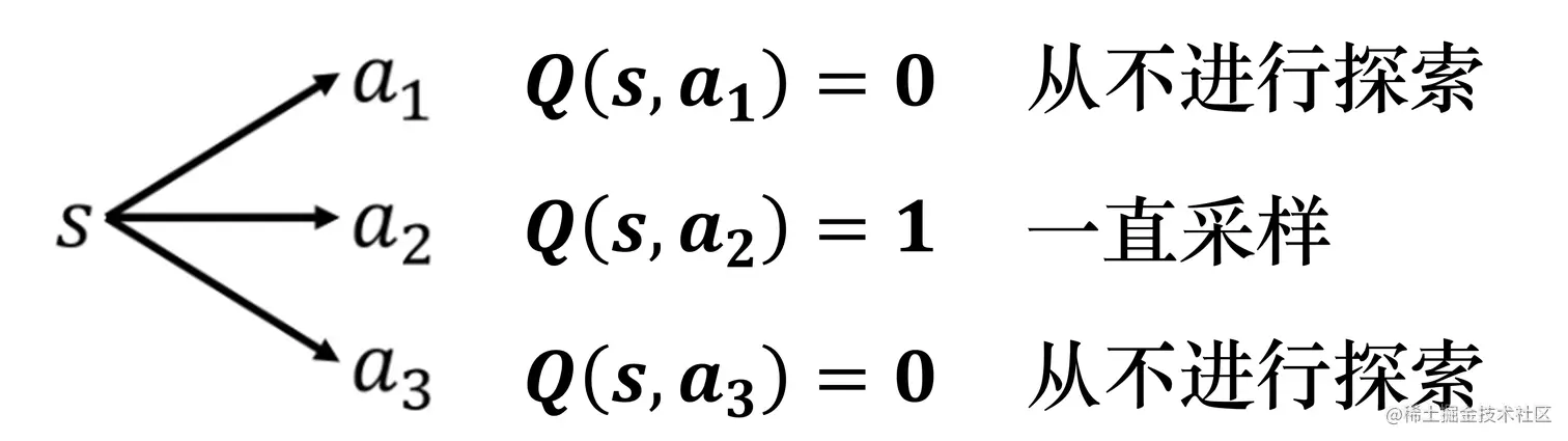 但是如图 4.11 所示,假设我们在状态 采取动作 ,它得到的值是正的奖励, 就会比其他动作的Q值要大。在采取动作的时候,谁的 Q 值 最大就采取谁,所以之后永远都只会采取 ,其他的动作就再也不会被采取了,这就会有问题。比如我们去一个餐厅吃饭。假设我们点了某一样菜,比如椒麻鸡,我们觉得还可以。接下来我们每次去就都会点椒麻鸡,再也不点别的菜了,那我们就不知道别的菜是不是会比椒麻鸡好吃,这是一样的问题。