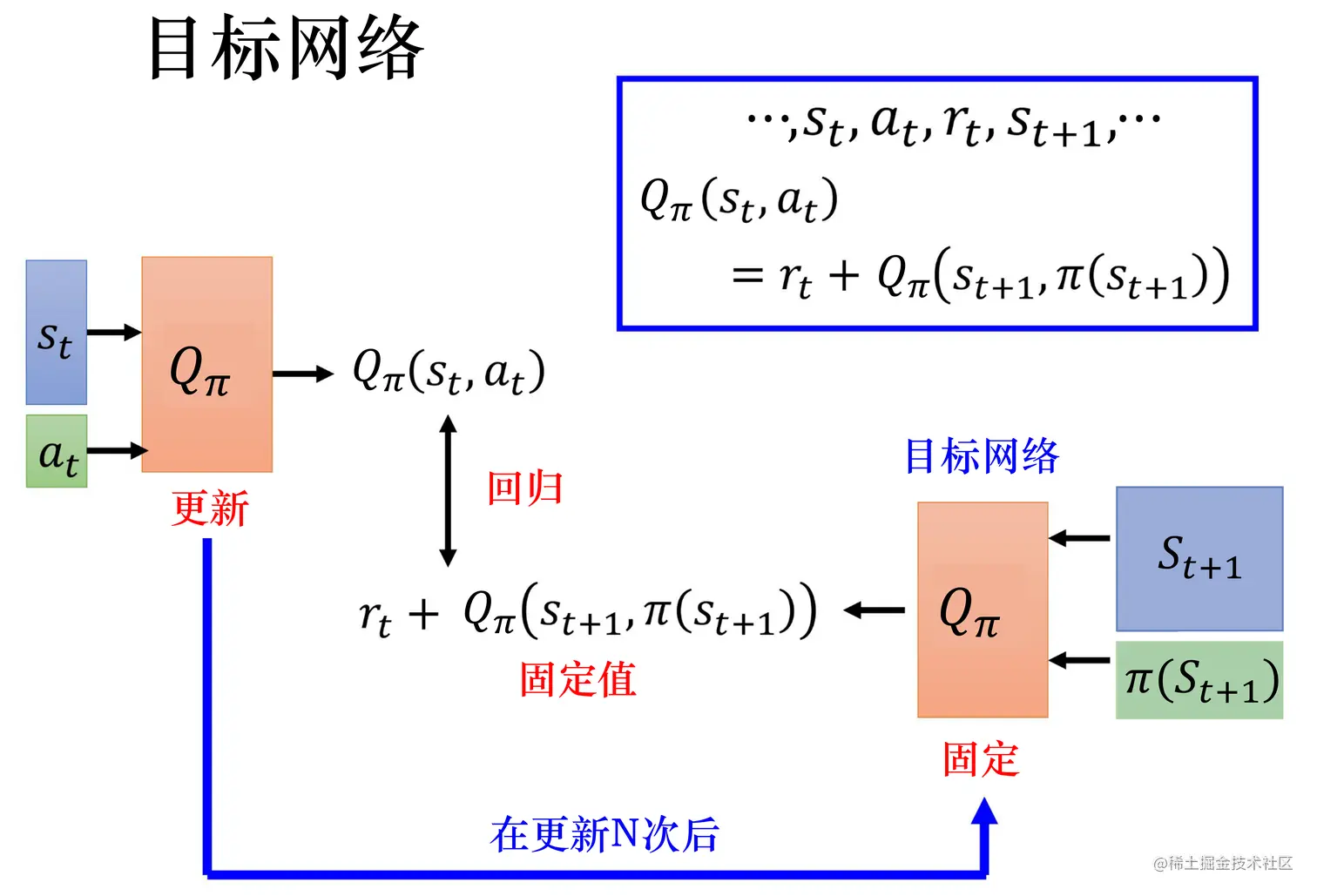 接下来讲一些在 深度Q网络 里一定会用到的技巧。第一个技巧是目标网络(target network)。我们在学习Q函数的时候,也会用到时序差分方法的概念。我们现在收集到一个数据,比如在状态 采取动作 以后,得到奖励 ,进入状态 。根据Q函数,我们可知
