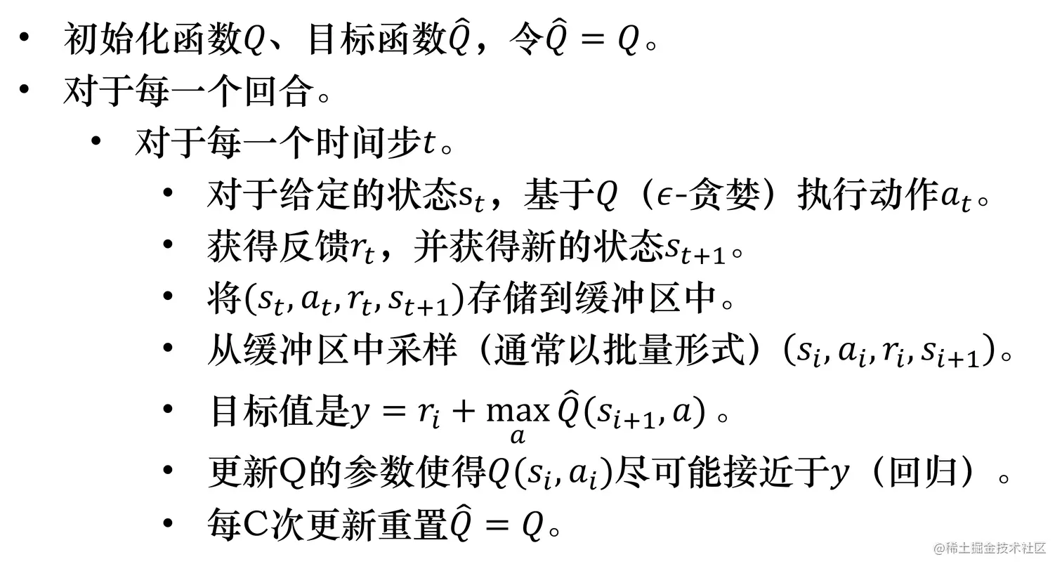 其中, 是让 值最大的动作。因为我们在状态 会采取的动作 就是可以让 值最大的那一个动作。接下来我们要更新 Q 值,就把它当作一个回归问题。我们希望 与目标越接近越好。假设已经更新了一定的次数,比如 次,设 , 那我们就把 设成 ,这就是 深度Q网络 算法。