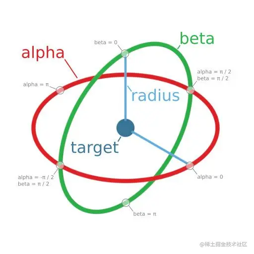 可将弧形旋转相机视为一个围绕其目标位置进行观察的摄像机,或者想象一下,它更像是一个环绕地球轨道运行的间谍卫星。相对于目标(地球)位置,相机自身的位置可以设置三个参数:即纵向旋转的alpha(弧度) ,横向旋转的beta(弧度) 和代表距目标位置距离的半径radius。