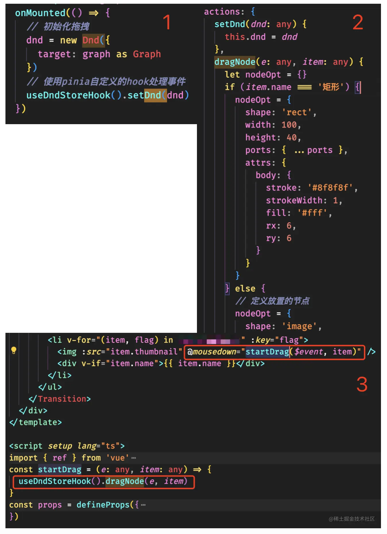 上图1进行初始化拖拽,并在图2的pinia中定义,其次,定义图3中对需要拖拽的元素添加@mousedown事件,对用图2中的dragNode方法,注意vue3事件中如果需要携带节点参数需要把$event带上哦。