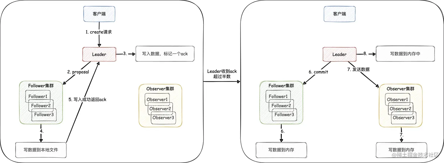 一些资料中会提到zookeeper在执行CRUD请求时,使用的是2PC,而 实际上它使用的是容错共识算法。我们以Create请求的流程为例(如下图),来加深和记忆这一知识