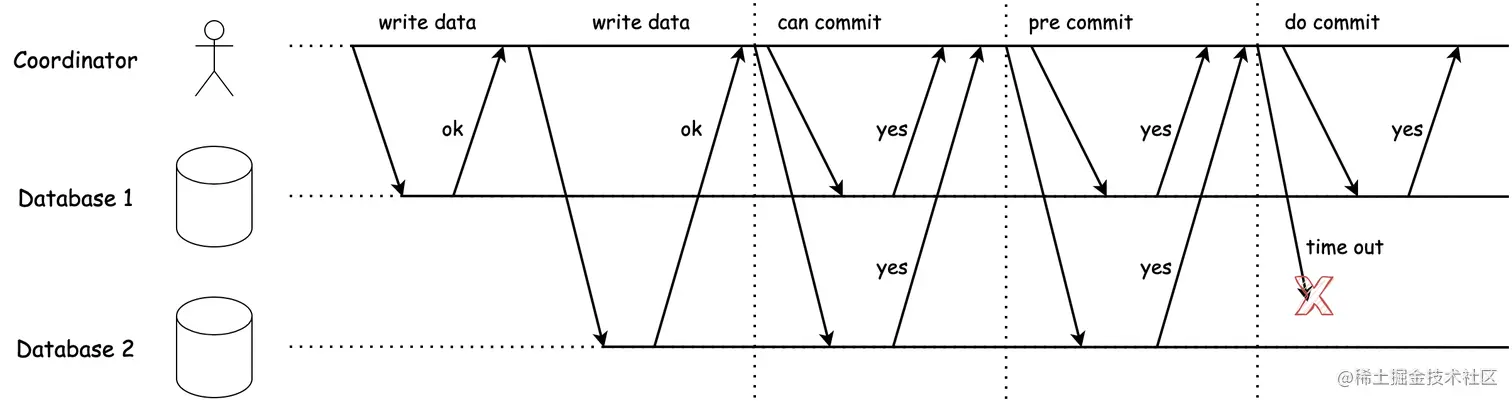- 如果协调者在DoCommit阶段回复的是中止请求,那么超时节点自顾自地提交事务就会发生数据不一致的情况