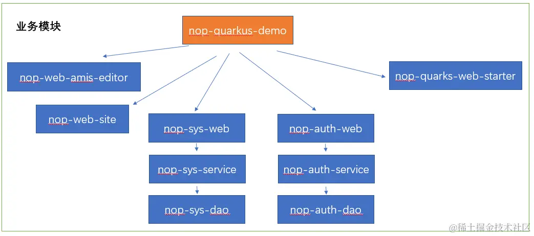 除此之外,我们也可以在一个应用中引用所有模块的web和service子模块,从而构成一个单体应用,例如nop-quarkus-demo模块中的做法。