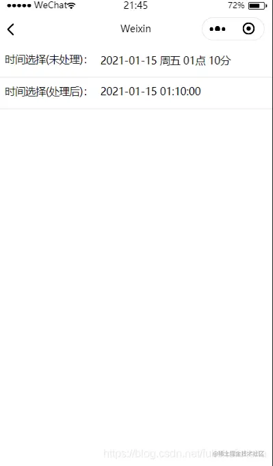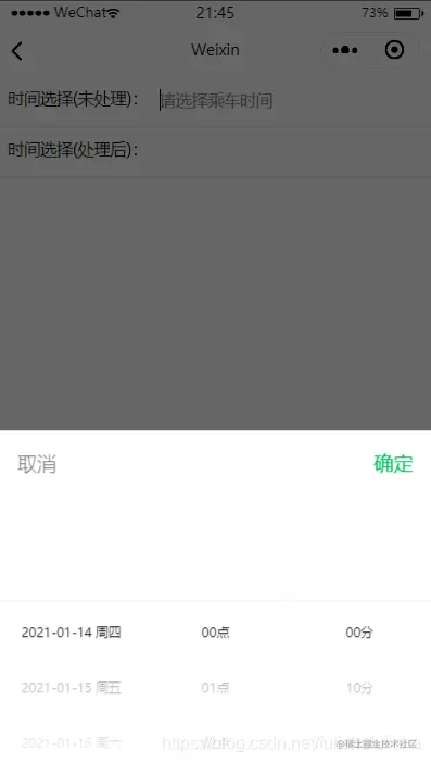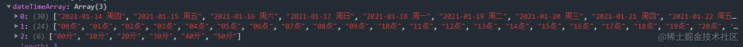 使用Picker组件(从底部弹起的滚动选择器) 从官方文档可知 我们要从底部弹出一个时间选择器 需要的是多列选择器 那么首先 range传入得是数组型得格式应该是:[[] [] []] ,如range(第一个数组)就应该是dateTimeArray这一个大数组 大数组里面嵌套多少个小数组 那这个时间选择器就弹出多少列(这里弹出的是三列) 例如选择2021-01-15 周五 02点 20分 那value(第二个数组)这个数组的值[1, 2, 2],当我们触发这个选择器的时候 当选择确定 就会改变value中数组的下标值 从而修改我们显示的数据