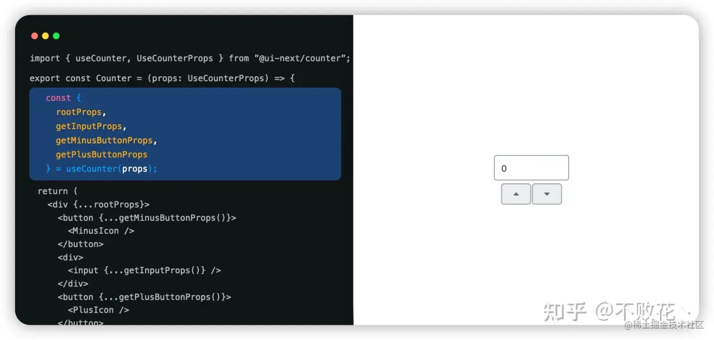 对于用户而言,我们只需把返回的 API 赋予到想赋予的标签上,那么就得到了一个只带交互能力的无头组件。