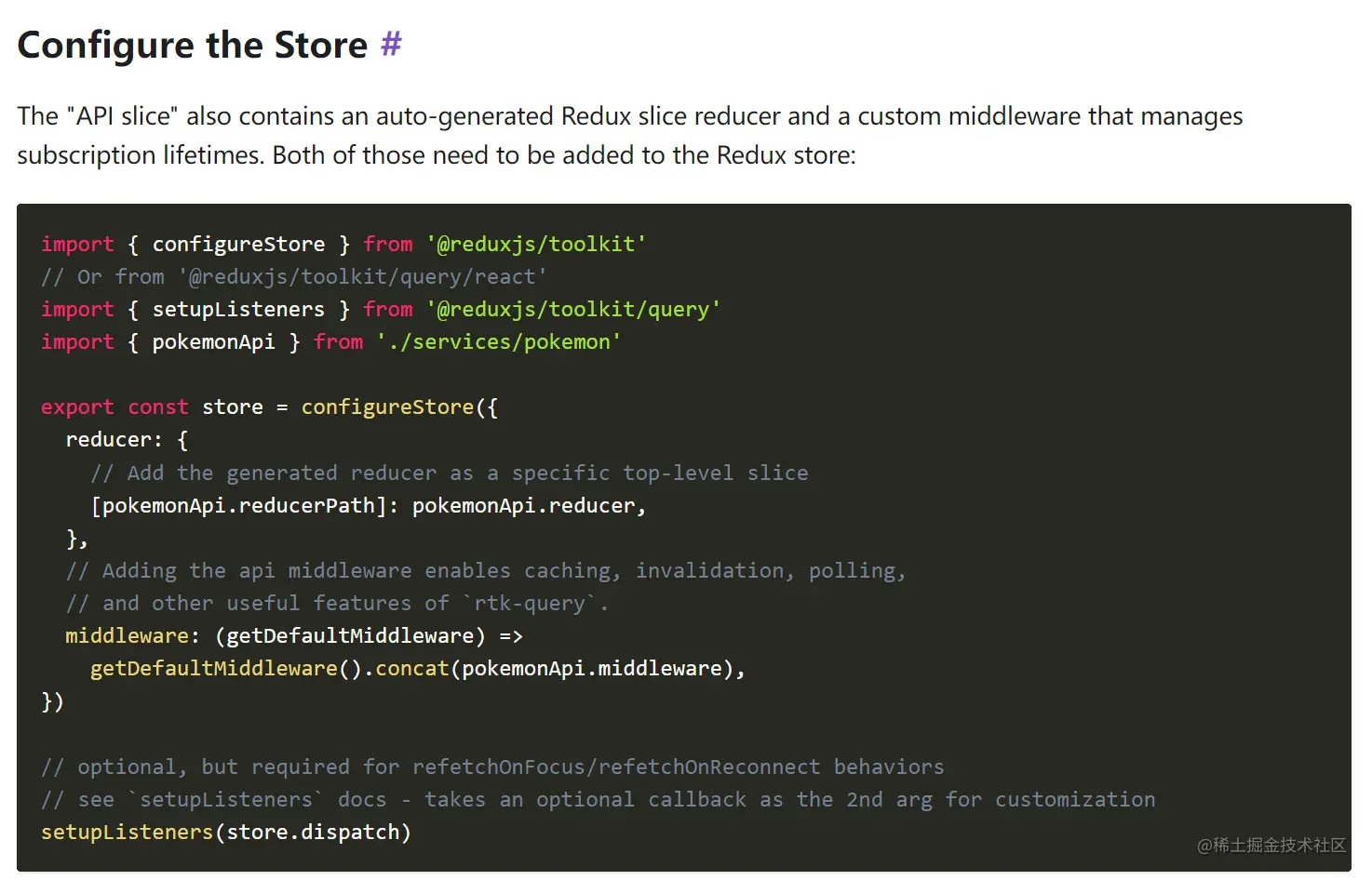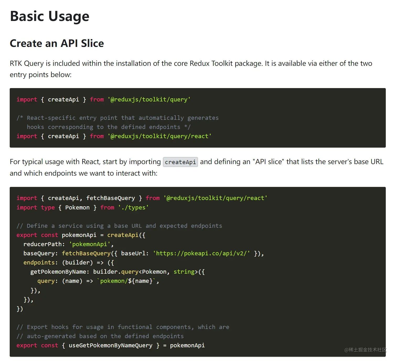 - 数据获取和缓存逻辑是构建在 Redux Toolkit 的 createSlice 和 createAsyncThunk API 之上的