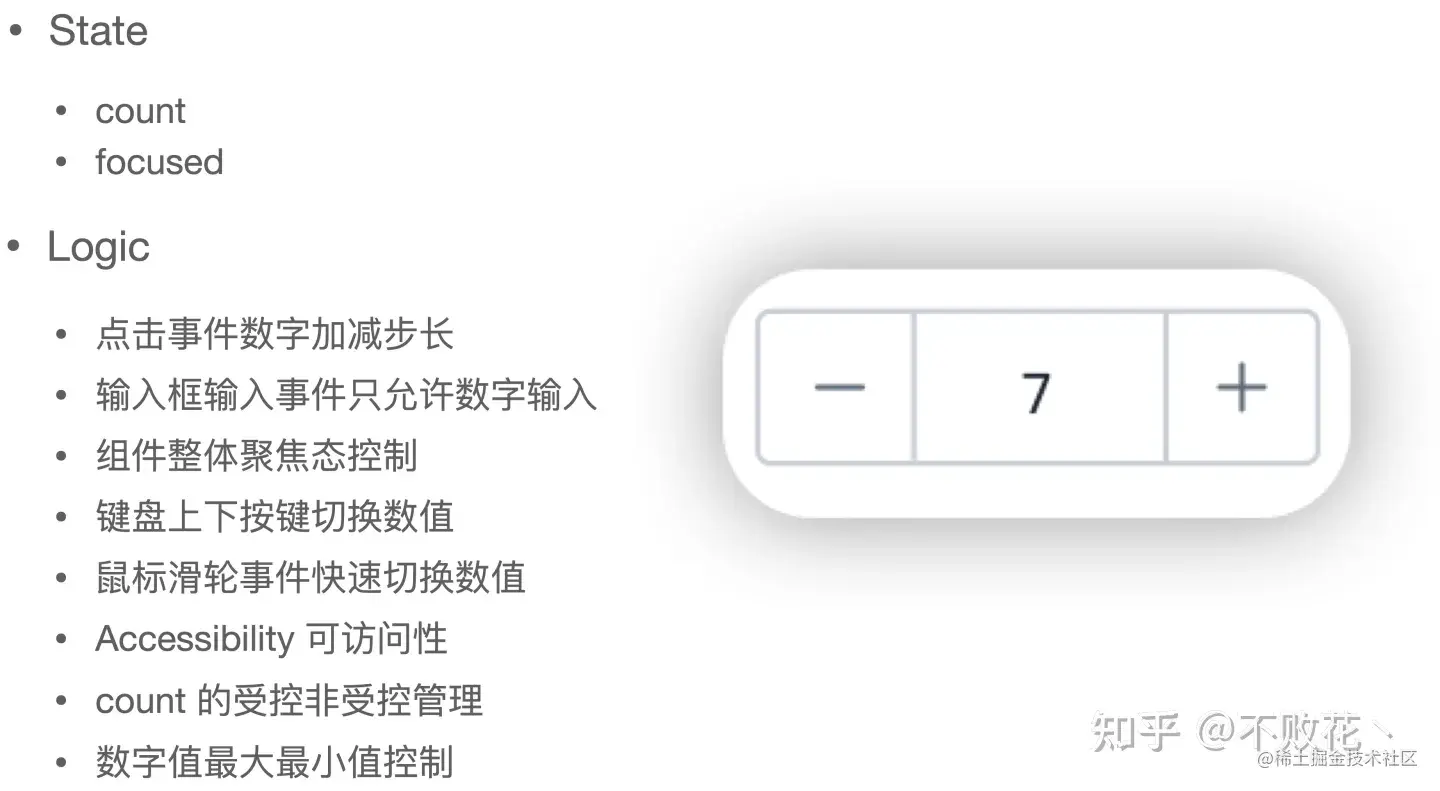 对于 Headless UI 组件,我们要做到第一件事,就是分析和抽离组件的状态以及交互逻辑。对于 Counter 组件,它的状态逻辑大致如下: