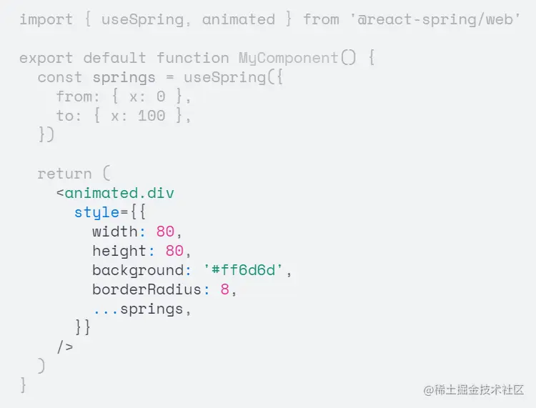React Spring 是一个用于构建交互式,数据驱动和动画 UI 组件的库。它可以为 HTML,SVG,Element,ThreeJS 等元素做动画。