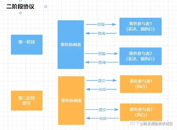 两阶段提交协议用于保证分布式事务的原子性,即所有的参与节点或者全部都执行或者全部不执行,其执行过程主要分为两个阶段: