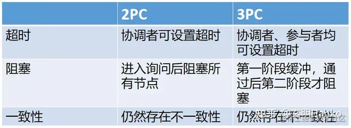 超时机制不同:2PC没有超时机制,一旦进入等待状态,参与者将一直等待直到收到响应;而3PC引入了超时机制,如果在规定的时间内没有收到大多数参与者的响应,则会回滚事务。