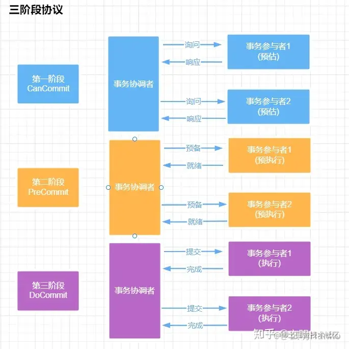 三阶段提交协议在协调者和参与者中都引入超时机制,并且把两阶段提交协议的第一个阶段拆分成了两步:询问,然后再锁资源,最后真正提交。
