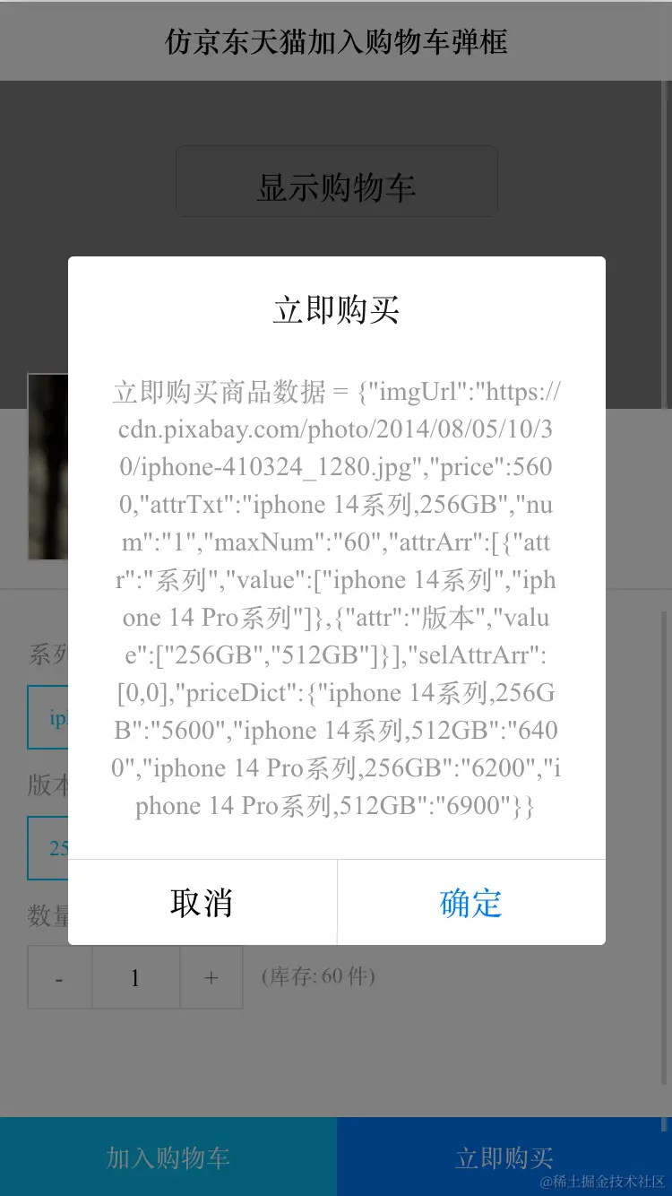content: '立即购买商品数据 = ' + JSON.stringify(item)