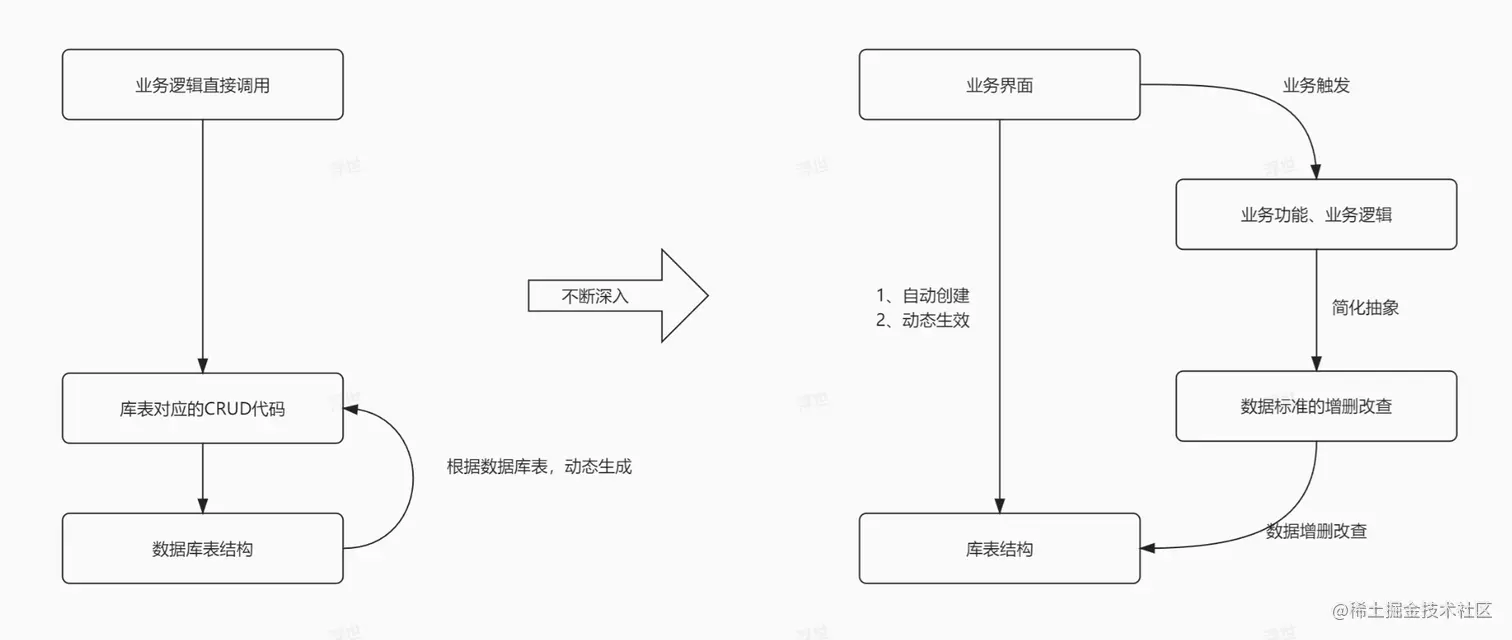 但随着低代码的概念不断持续发酵与升华,有跟多的管理者希望不仅仅是生成中间的CRUD代码,能否把另外两端的代码也生成了,这个也就是 “零代码”的出发点了,而且这种模式有个bug一旦加入了业务代码后,就很难再进行二次配置化,所以这也成为“一次性”的低代码,如果我们要实现“持续化”低代码 如何做呢?