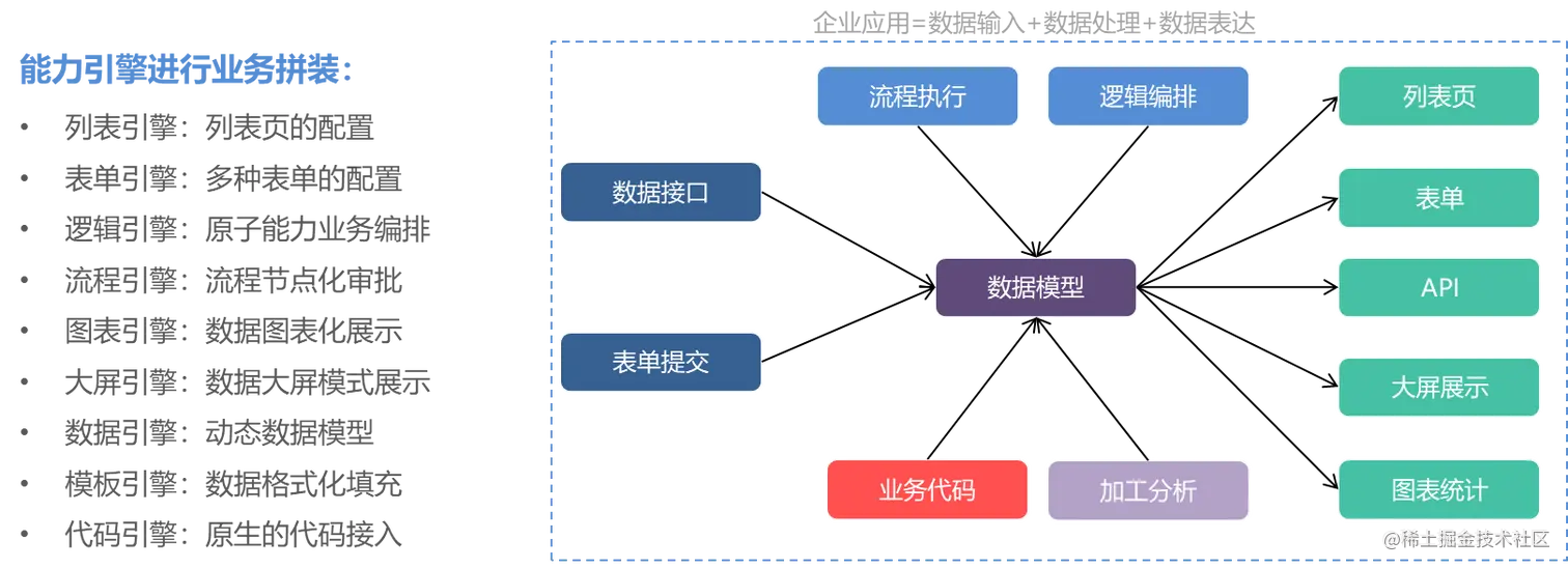 数据模型是各个能力引擎之间对数据加工、存储的核心,也是各个引擎能做好联动使用的基础,而且可以做到数据层与页面级的分层级控制。而且有了动态的数据模型,传统的代码(前端、后端)也是可以接入到配置的过程中来,从而实现0代码+100%代码的融合使用。